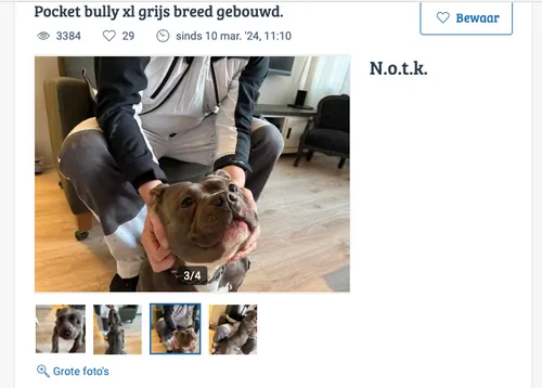 De oorspronkelijke eigenaren uit Amersfoort verklaarden dat ze door nieuwe werkomstandigheden niet langer voor het dier konden zorgen. Een foto op de advertentie toont een man die de hond vasthoudt.
