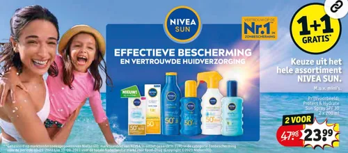 Het gaat om een zomeractie: bij aankoop van één Nivea Sun-product ontvang je er gratis één extra.