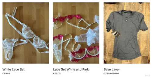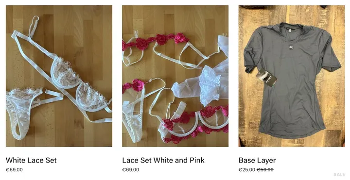 "Ik verkoop nieuwe sportkleding, gedragen sportkleding, schoenen, sokken, intieme items en lingerie. Hoe werkt het? Jij kiest wat je wilt – gedragen of ongedragen – en ik zorg ervoor dat het naar je wordt verzonden. Ik verzend wereldwijd."