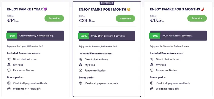 De maandelijkse prijzen zijn ook gedaald. Eerst betaalde je 35 euro voor het eenmalig meegenieten van Famke's plaatjes, terwijl dat nu nog maar 24,50 euro per maand is. Dit terwijl haar FanCentro-account pas een paar maanden actief is.