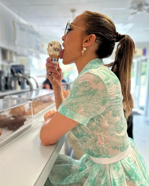 Andere foto's laten zien hoe ze geniet van een ijsje in een mintgroene en witte jurk, een moment deelt met haar zus Lynda Lopez, en alledaagse situaties vastlegt, zoals een speelse kitten die uit een Super Mario-rugzak kijkt.