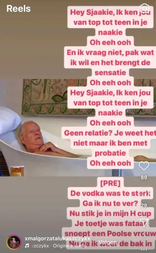 In een Instagram-reel deelde Malgosia doodleuk een foto van Albert in bad, vergezeld van een cryptische en gedurfde tekst.