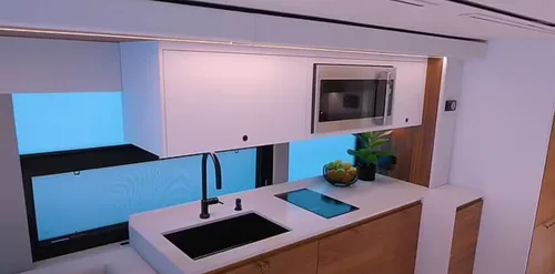 In de keuken ontdekt Erik een reeks handige functies, waaronder een inductiekookplaat, een roestvrijstalen magnetron en een ladevaatwasser.