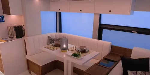 Er zijn twee banken, waarvan één kan worden uitgeklapt tot een bed, en een eetgedeelte met een uitschuifbare tafel.