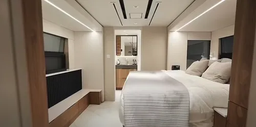 In de slaapkamer vindt hij een kingsize bed, een 50-inch uitschuifbare televisie en twee kasten als onderdeel van de luxe inrichting.