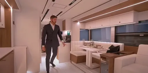 In het hoofdgedeelte van het voertuig vindt hij een ruime woonkamer met een 65-inch televisie die achter het cockpitgebied naar beneden kan worden geschoven.