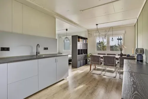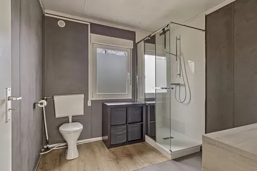 Naast de keuken is er ruimte voor een zithoek, eettafel en slaapkamer. De woning wordt verwarmd met elektrische kachels en er liggen acht