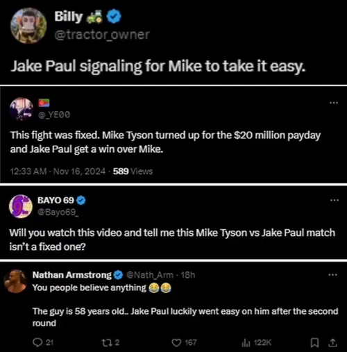 Een fan schreef op X dat Paul een signaal gaf aan Tyson om het rustig aan te doen, met daarbij een korte video waarin Tyson een stoot op het gezicht van Paul landt.