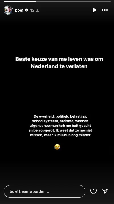 De rapper noemt het een beslissing die zijn leven heeft veranderd: "De beste keuze van mijn leven was om Nederland te verlaten." In een post op Instagram legt hij uit dat deze keuze voortkomt uit zijn onvrede over verschillende aspecten van de Nederlandse samenleving.