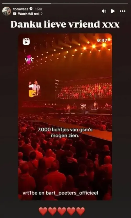 Peeters vroeg zijn publiek van 7000 mensen om Waes een spoedig herstel te wensen met verlichte telefoons. Waes deelde een video van het moment op Instagram en schreef: „Danku lieve vriend xxx”, gevolgd door rode hartjes.