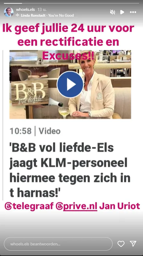 Els is ontzettend boos na het bekijken van deze uitzending. Sterker nog, ze eist dat De Telegraaf deze verwijdert. "Ik geef jullie 24 uur voor een rectificatie en excuses!”, schrijft ze in haar Instagram Stories.