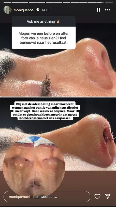 Op Instagram zijn haar volgers nieuwsgierig naar het resultaat van haar operatie. Eén van hen vraagt zich af: "Mogen we een before- en afterfoto van je neus zien? Heel benieuwd naar het resultaat!"