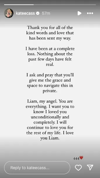 Op Instagram bedankte Kate haar volgers voor alle steun die ze heeft ontvangen in deze moeilijke tijd. Ze vroeg om ruimte en privacy om het verlies te verwerken.