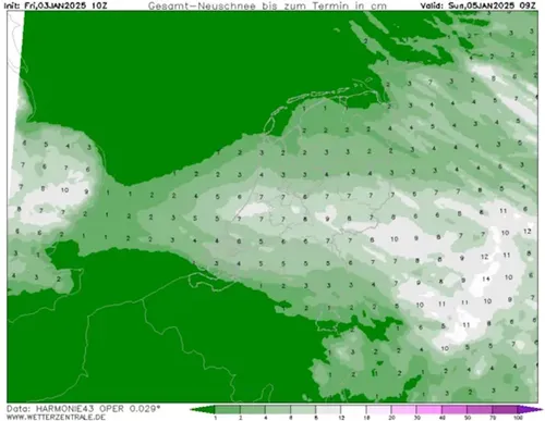 Het Franse ARPEGE en het Belgische ALARO-model voorspellen de grootste hoeveelheden sneeuw.