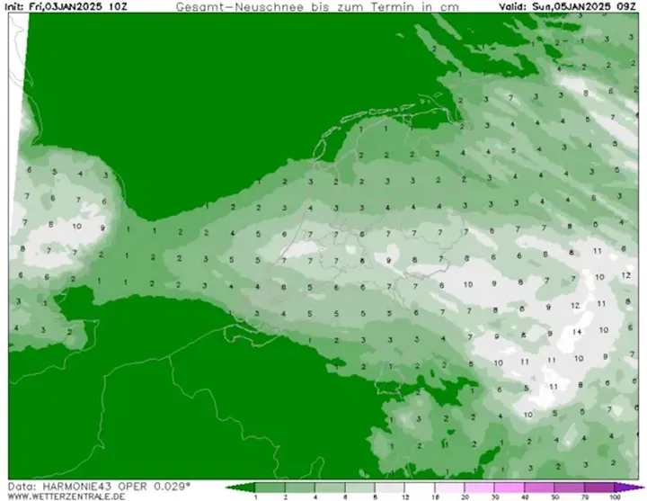 Het midden van Nederland lijkt de meeste sneeuw te krijgen, met potentieel een dekking van 10 centimeter.